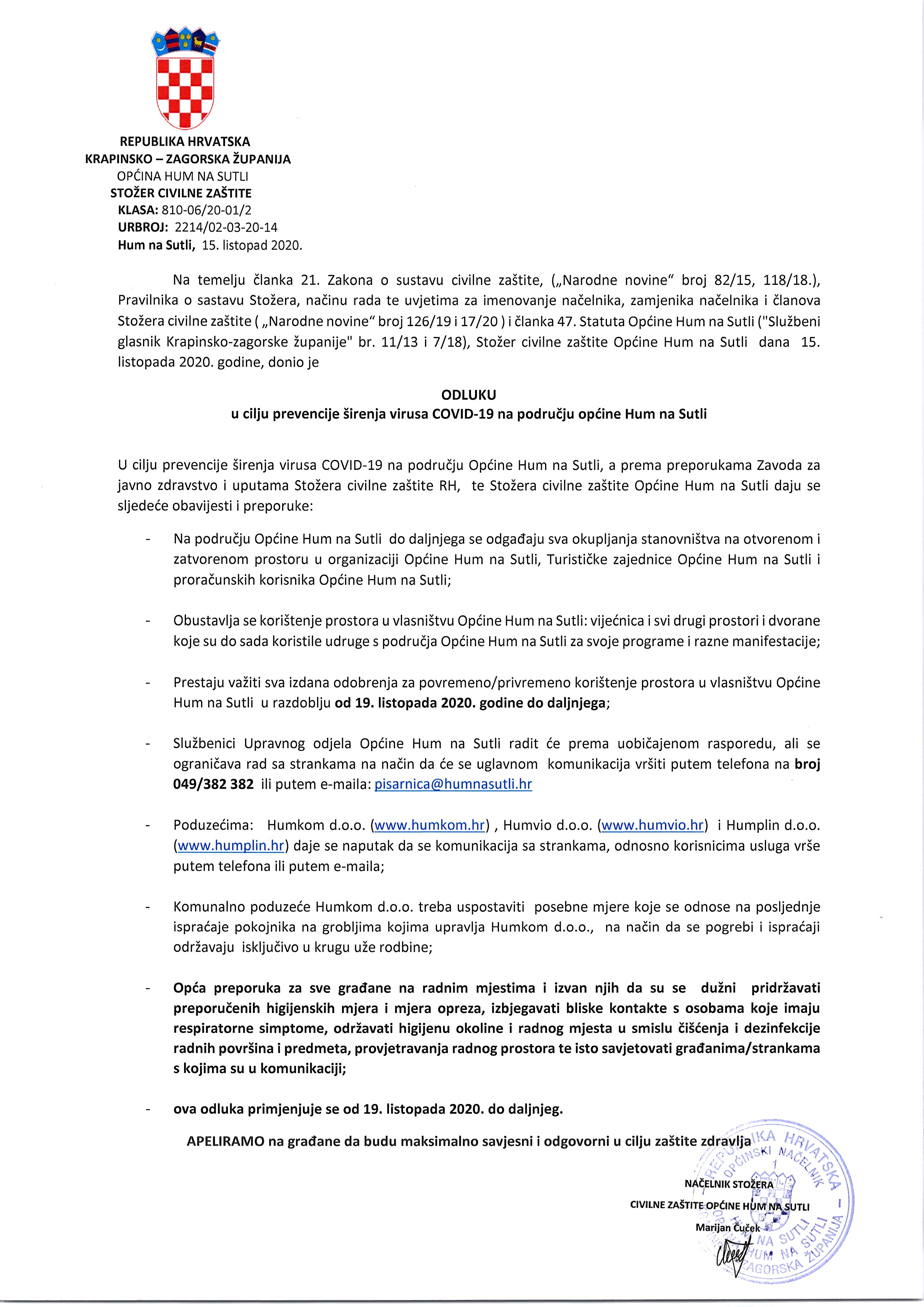 se ograničava rad sa strankama na način da će se uglavnom komunikacija vršiti putem telefona na broj 049/382 382 ili putem e-maila: pisarnica@humnasutli.hr