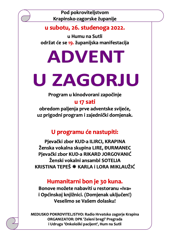 bregi“ Pregrada i Udruge „Onkološki pacijent“, iz Huma na Sutli, a pod pokroviteljstvom Krapinsko-zagorske županije i medijskim