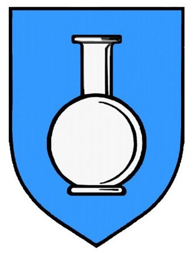 u plavom polju srebrna staklena posuda. Posuda ima okruglo