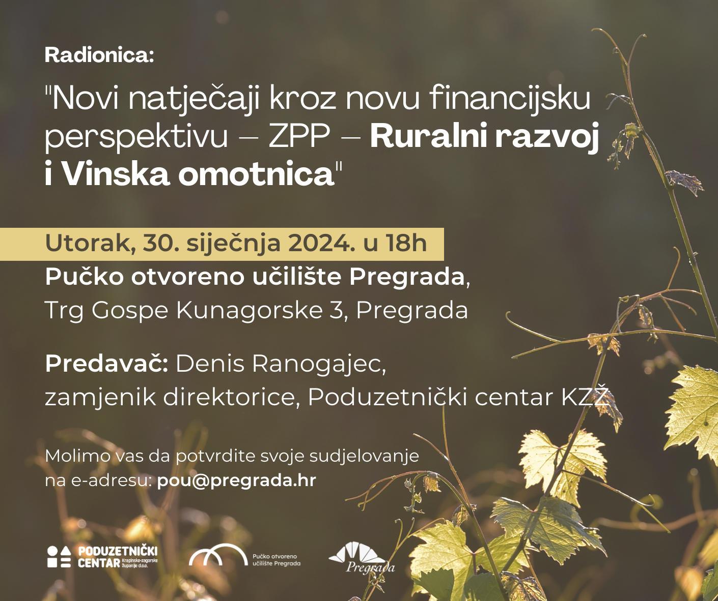 Radionica: "Novi natječaj kroz novu financijsku perspektivu - ZPP - Ruralni razvoj i Vinska omotnica", 30.1.2024. u 18 sati, Pučko otvoreno učilište Pregrada